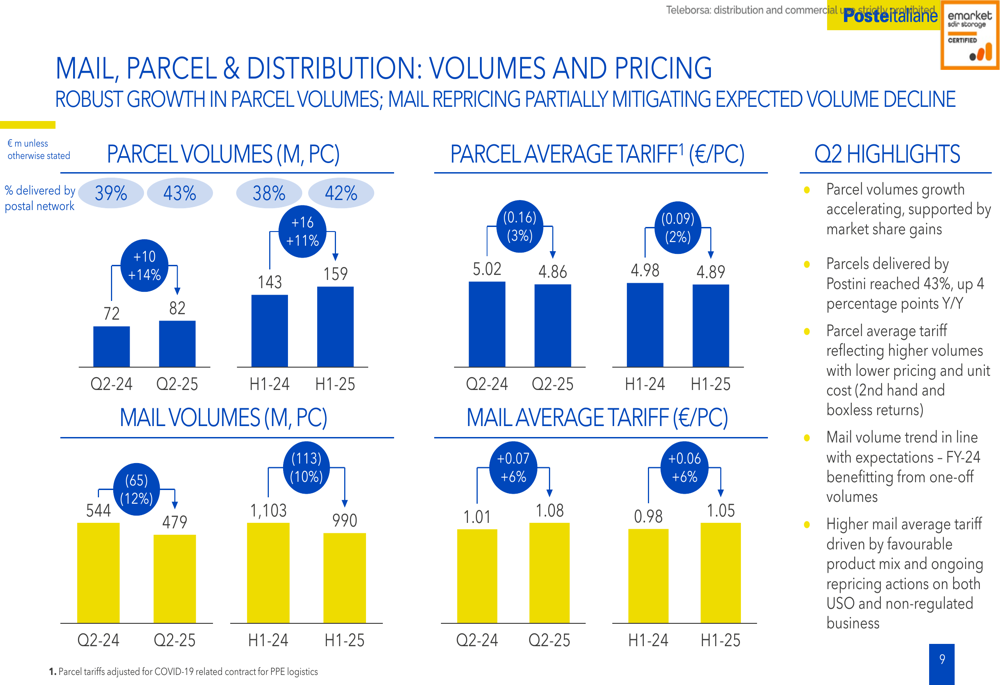 Parcel volumes showed robust growth, with volumes increasing and the business now representing 42% of the segment in H1 2025, up from 38% in the same period last year. Meanwhile, mail volumes declined from 1,103 million pieces in H1 2024 to 990 million in H1 2025, though this was partially mitigated by an increase in the average tariff from €0.98 to €1.05 per piece.