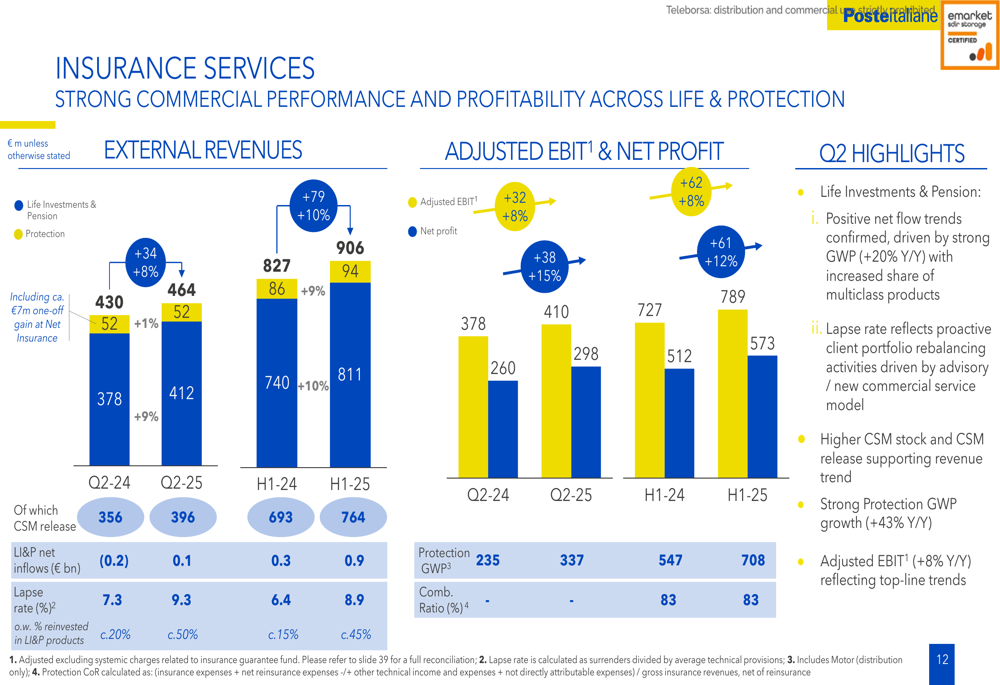 The Insurance Services segment demonstrated strong commercial performance and profitability across both Life & Protection products. External revenues increased by 10% to €906 million in H1 2025, while adjusted EBIT grew by 8% to €789 million.