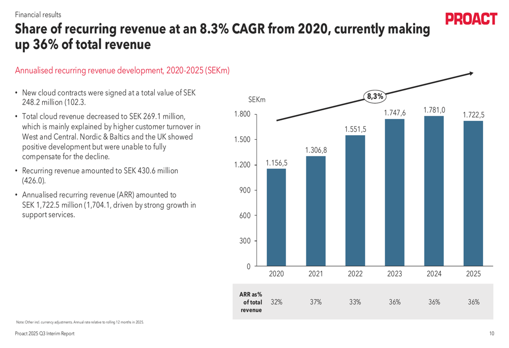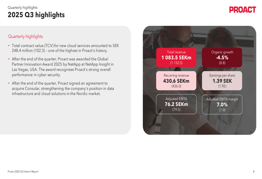 A significant bright spot was the total contract value (TCV) for new cloud services, which amounted to SEK 248.4 million, demonstrating continued traction in Proact’s strategic focus areas. The company also highlighted its post-quarter achievements, including being awarded the Global Partner Innovation Award 2025 by NetApp and signing an agreement to acquire Danish company Consular.