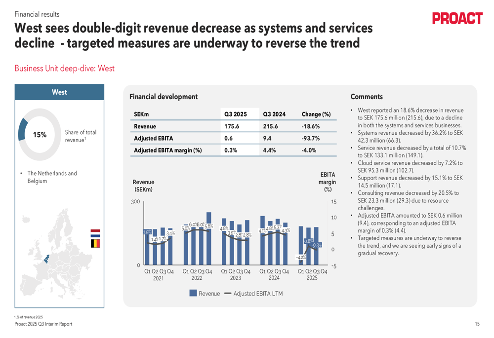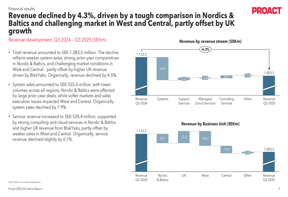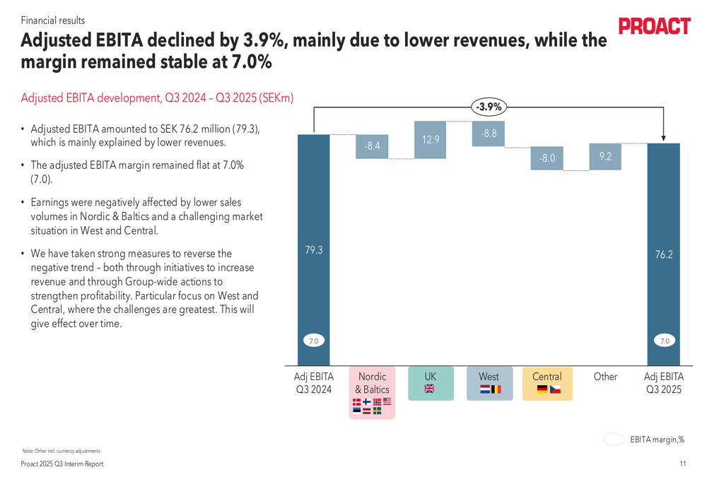 Proact reported total revenue of SEK 1,083.5 million for Q3 2025, down 4.5% compared to the same period last year. The adjusted EBITA reached SEK 76.2 million, representing a 7.0% margin, which remained stable despite the revenue decline.