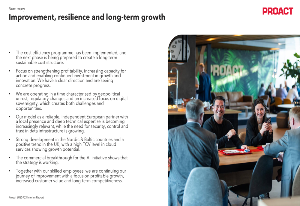 CEO Magnus Lönn highlighted that the company is operating in a time characterized by geopolitical unrest but remains confident in Proact’s model as a reliable, independent European partner. He noted the strong development in the Nordic & Baltic countries, the positive trend in the UK, and the commercial breakthrough for the AI initiative as reasons for optimism.
