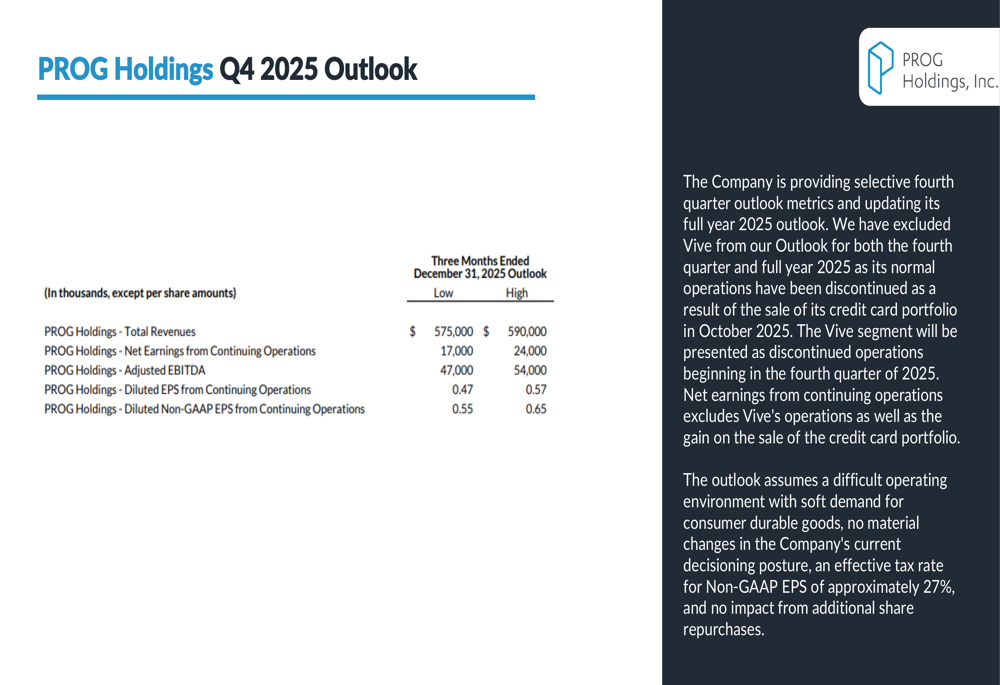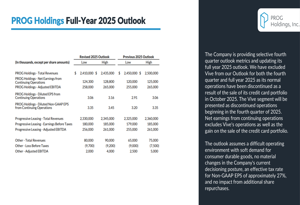 PROG Holdings provided an updated outlook for the remainder of 2025, projecting full-year revenues between $2.41 billion and $2.435 billion, with adjusted EBITDA expected to range from $258 million to $265 million. The company anticipates diluted non-GAAP EPS from continuing operations to be between $3.35 and $3.45.