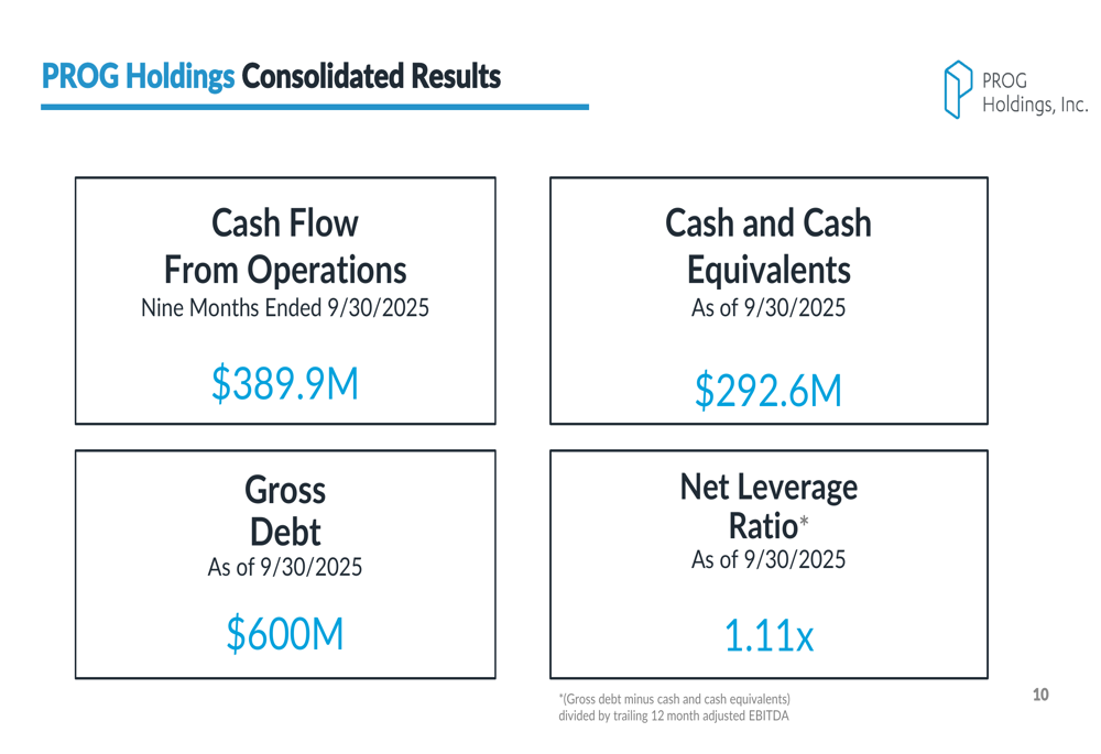 PROG Holdings maintained a strong financial position at the end of Q3 2025, with substantial cash flow generation and a conservative leverage profile. The company reported $389.9 million in cash flow from operations for the nine months ended September 30, 2025, and held $292.6 million in cash and cash equivalents.