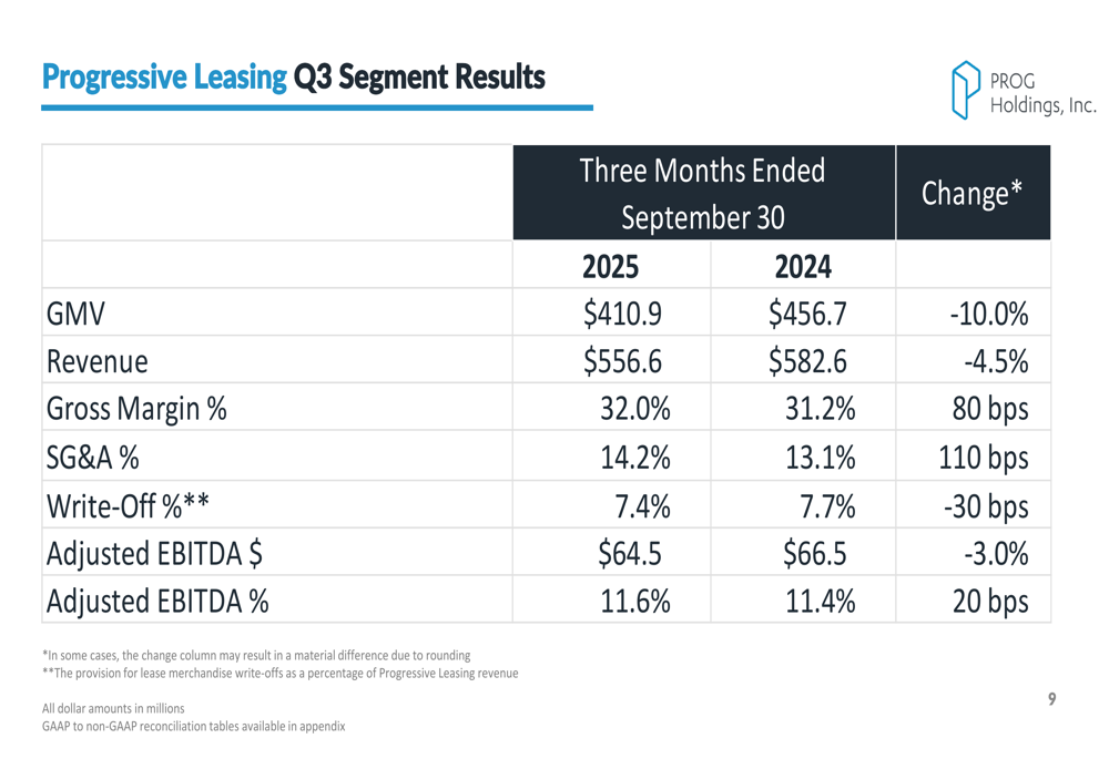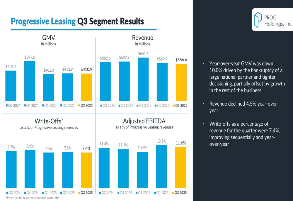 Despite these challenges, Progressive Leasing demonstrated improved operational efficiency, with write-offs as a percentage of revenue improving to 7.4% from 7.7% in the prior year. The segment also achieved gross margin expansion of 80 basis points to 32.0% and a slight improvement in Adjusted EBITDA margin to 11.6%.