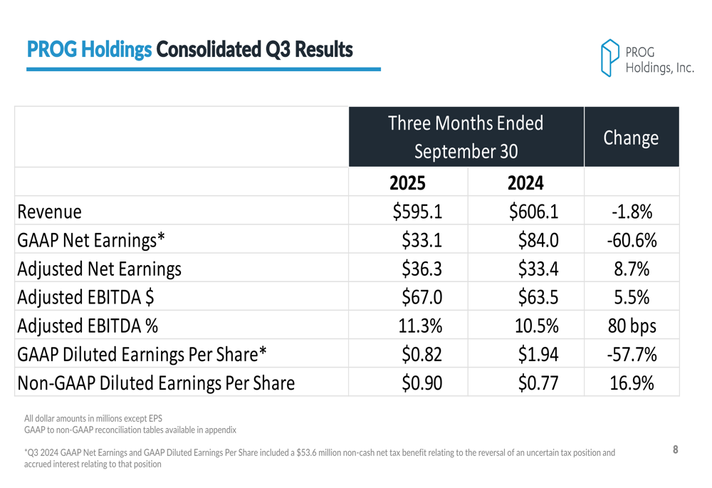 PROG Holdings delivered solid profitability improvements despite revenue headwinds in the third quarter. The company achieved a 16.9% year-over-year increase in Non-GAAP diluted earnings per share, reaching $0.90 compared to $0.77 in Q3 2024. Adjusted EBITDA grew by 5.5% to $67.0 million, with margins expanding from 10.5% to 11.3% of consolidated revenues.