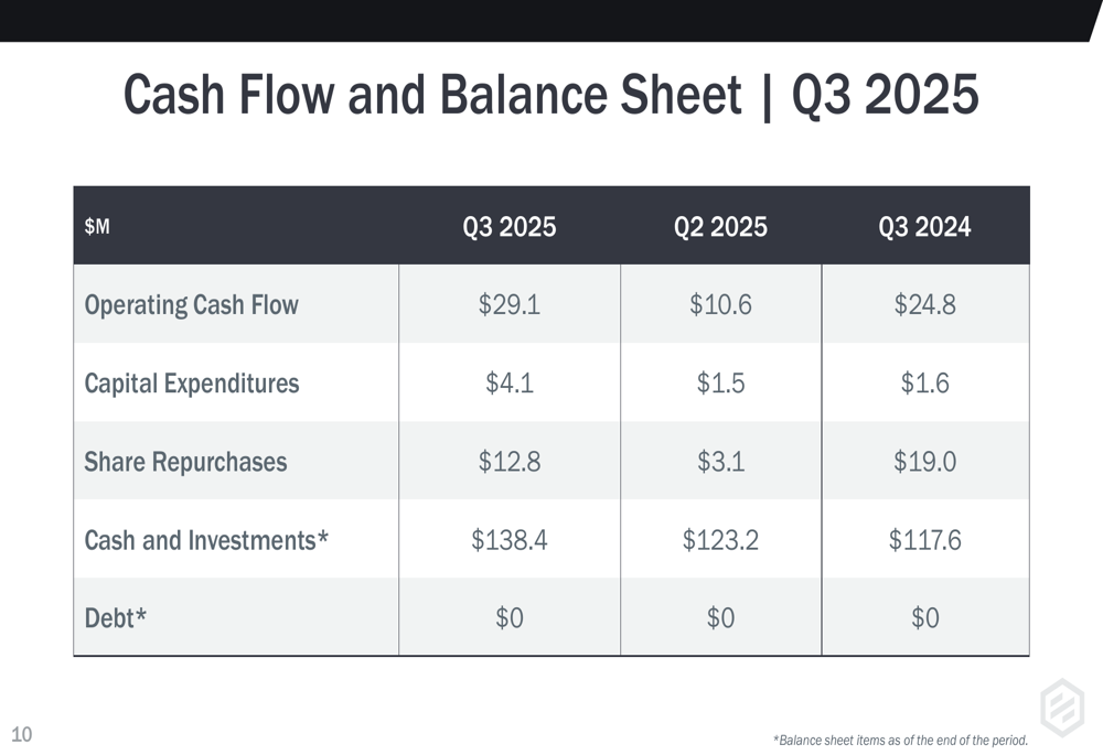 The company demonstrated strong cash generation capabilities, with operating cash flow of $29.1 million in Q3 2025, up from $10.6 million in the previous quarter and $24.8 million in the same period last year. Proto Labs maintains a solid balance sheet with $138.4 million in cash and investments and zero debt, providing financial flexibility for future investments and share repurchases. During the quarter, the company repurchased $12.8 million in shares, up significantly from $3.1 million in Q2 2025.