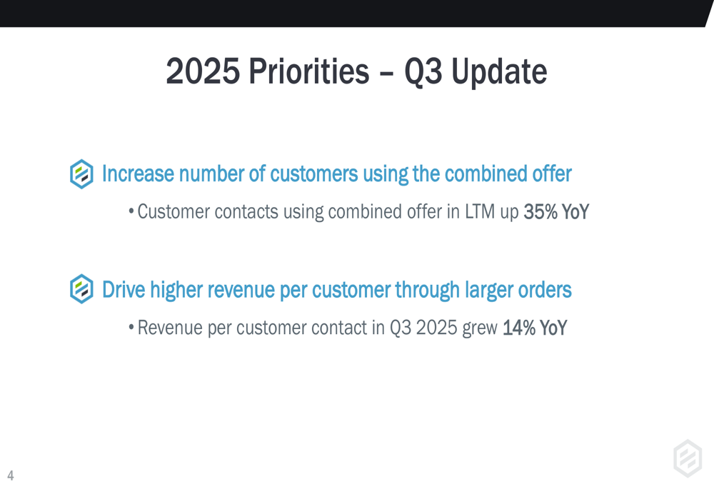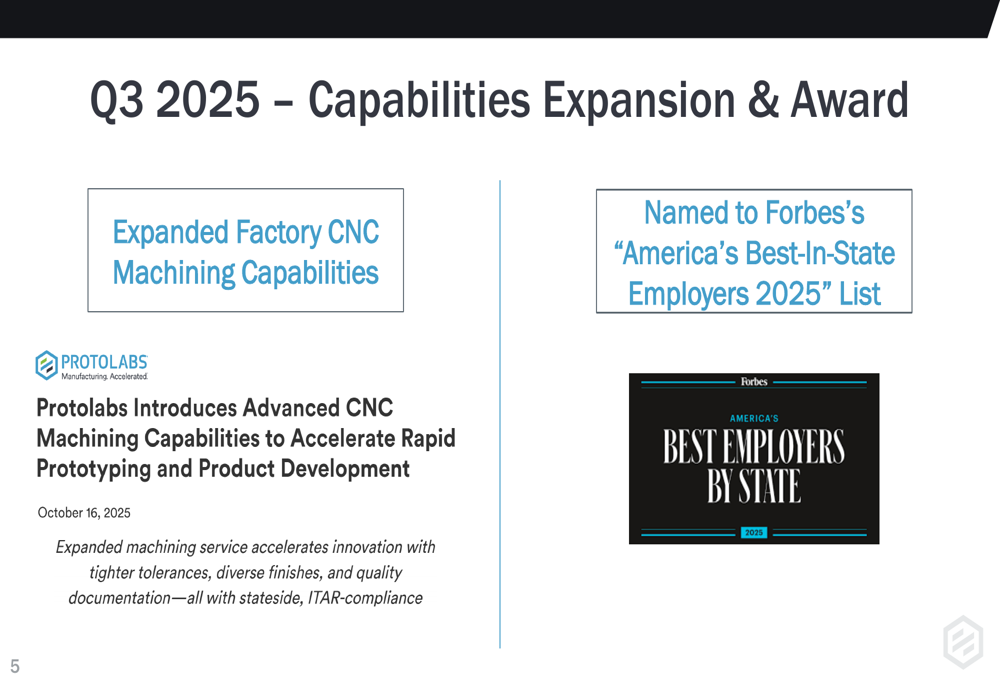 Proto Labs is executing on strategic priorities focused on increasing customer adoption of its combined service offerings and driving higher revenue per customer. The company reported a 35% year-over-year increase in customer contacts using combined offerings over the last twelve months, while revenue per customer contact grew 14% in Q3 2025 compared to the same period last year.