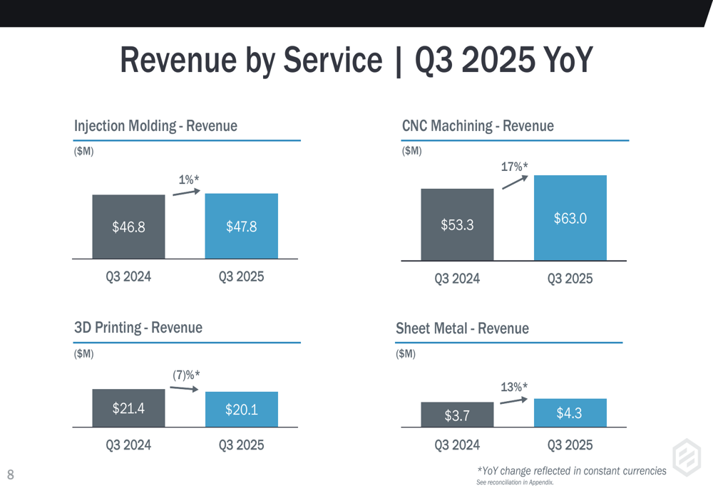 CNC machining emerged as the standout performer among Proto Labs’ service offerings, with revenue increasing 17% year-over-year to $63.0 million. Injection molding saw modest growth of 1%, while sheet metal revenue increased by 13%. However, 3D printing revenue declined by 7% compared to Q3 2024.
