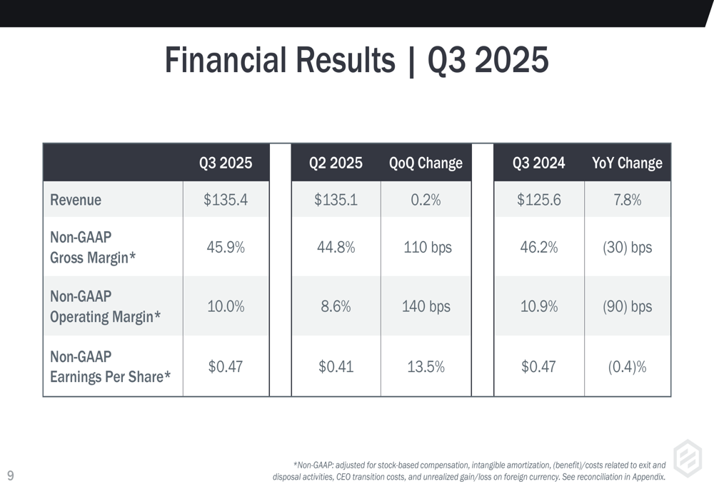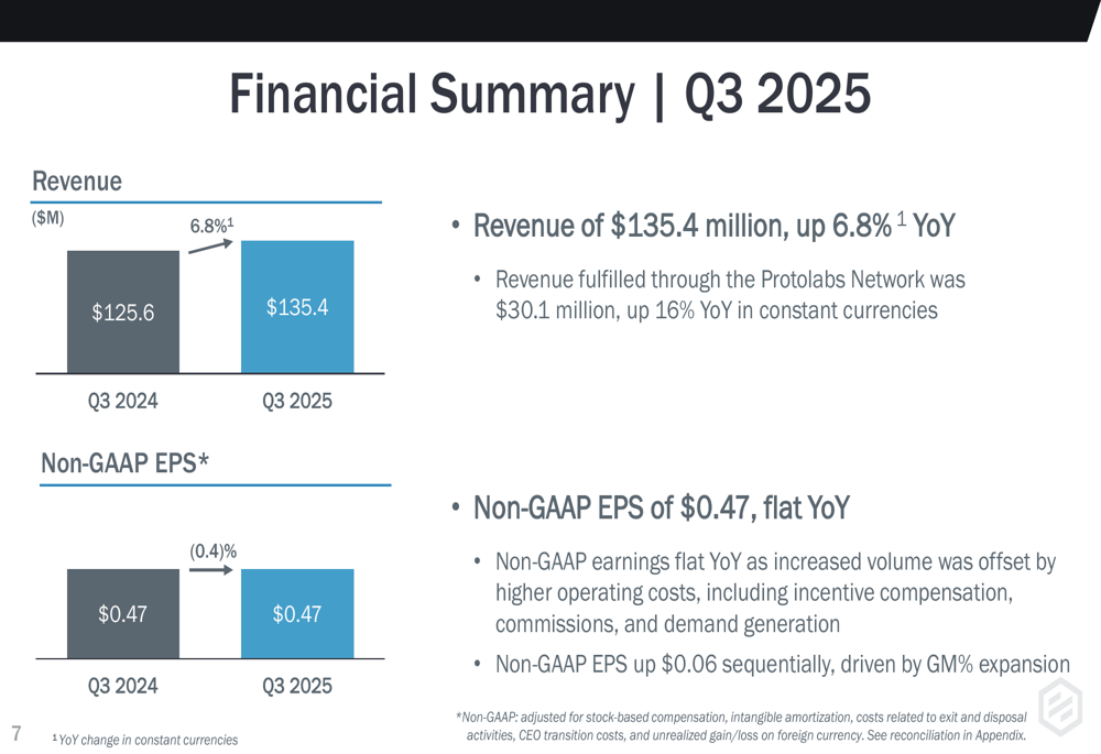 Proto Labs reported Q3 2025 revenue of $135.4 million, representing a 6.8% year-over-year increase in constant currencies. Non-GAAP earnings per share remained flat year-over-year at $0.47, though this exceeded market expectations of $0.39 per share. The company’s network fulfillment revenue reached $30.1 million, growing 16% compared to the same period last year.