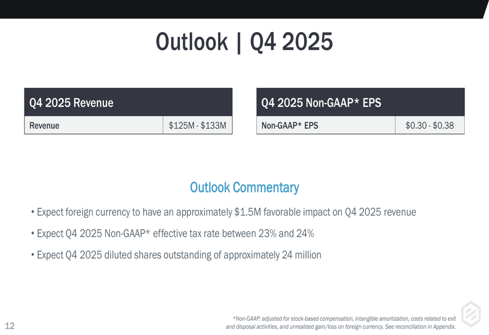 Looking ahead to Q4 2025, Proto Labs provided revenue guidance of $125 million to $133 million and non-GAAP EPS guidance of $0.30 to $0.38. The company expects foreign currency to have an approximately $1.5 million favorable impact on Q4 revenue, with a projected non-GAAP effective tax rate between 23% and 24%.