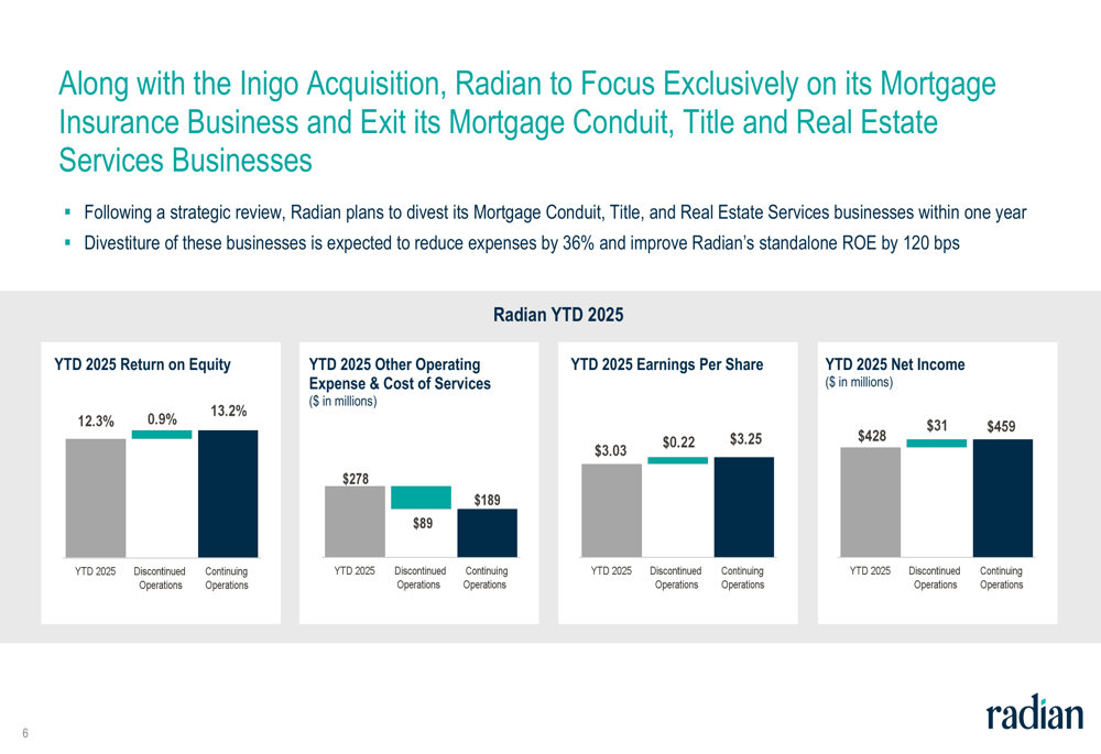 Simultaneously, Radian announced plans to focus exclusively on its Mortgage Insurance business while exiting its Mortgage Conduit, Title, and Real Estate Services businesses. Following a strategic review, the company intends to divest these operations within one year.