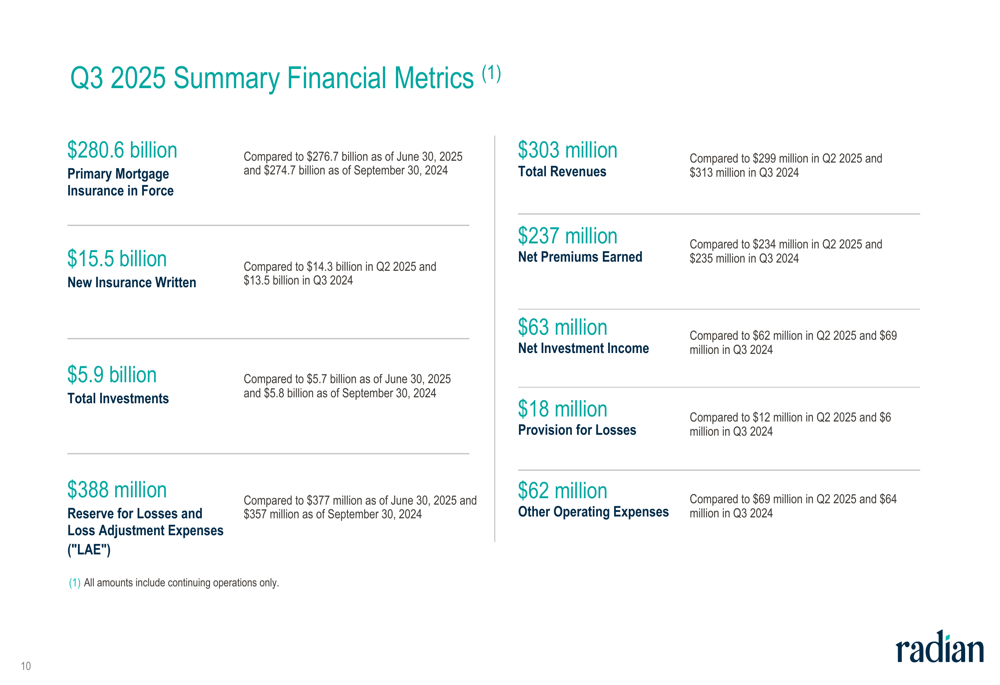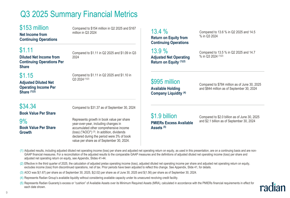 Radian reported solid financial results for the third quarter of 2025, with net income from continuing operations reaching $153 million, translating to $1.11 per diluted share. The company achieved a return on equity from continuing operations of 13.4% and an adjusted net operating return on equity of 13.9%.