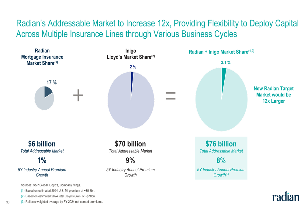 Currently, Radian holds a 17% share of the $6 billion mortgage insurance market, while Inigo has a 2% share of the $70 billion Lloyd's market. The combined entity will have a 3.1% share of a $76 billion total market.