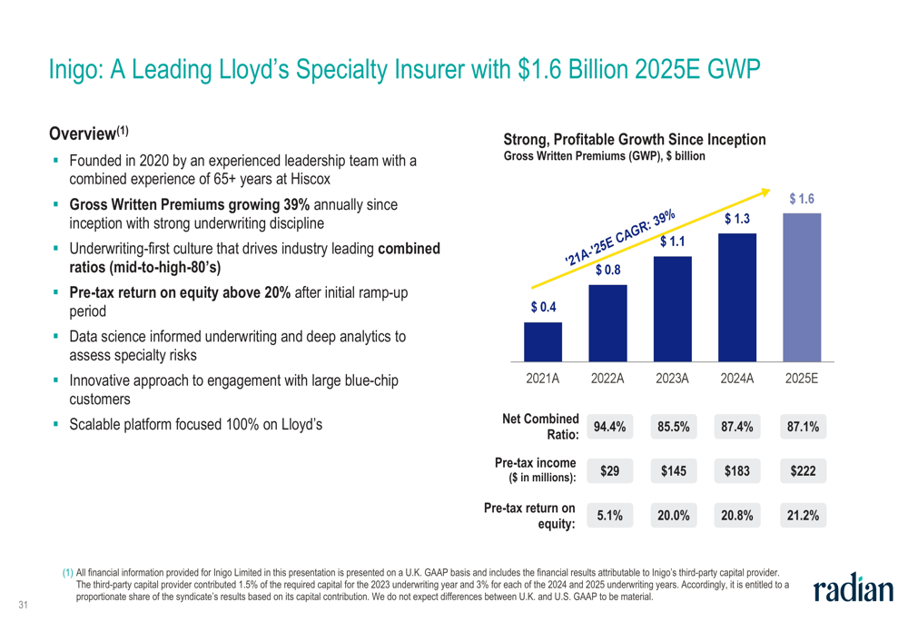 The Inigo acquisition significantly expands Radian's addressable market. Inigo has demonstrated strong growth since its founding in 2020, with gross written premiums increasing at a 39% rate.