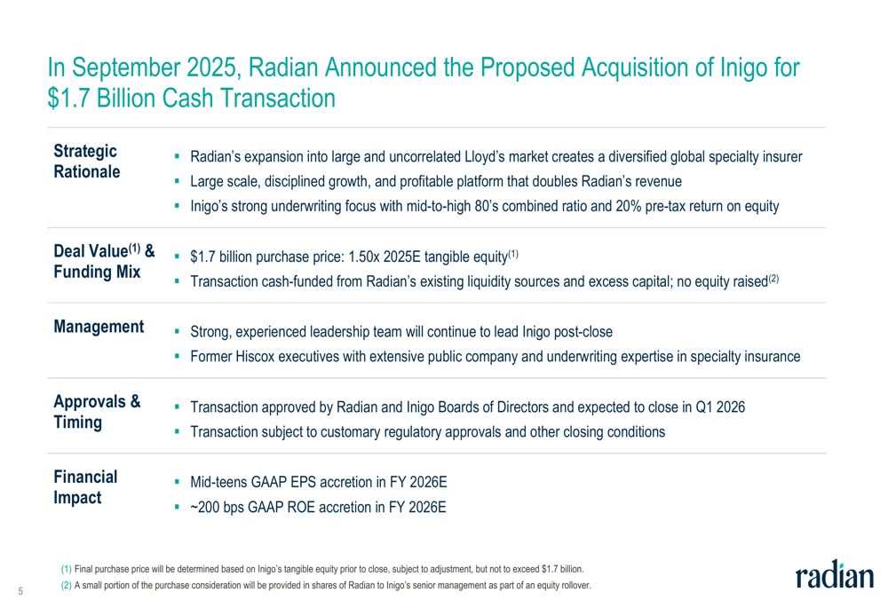 The centerpiece of Radian's strategic transformation is the proposed acquisition of Inigo, a Lloyd's specialty insurer, for $1.7 billion in cash. This transaction, expected to close in Q1 2026, represents a pivotal shift in Radian's business model.