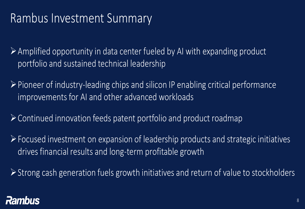 The investment summary slide outlines Rambus’s strategic focus and value proposition: