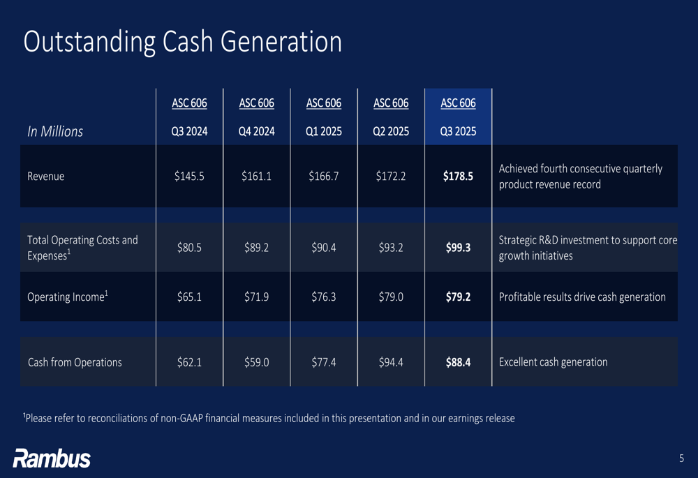Rambus reported total revenue of $178.5 million for Q3 2025, representing a significant increase from $145.5 million in the same period last year. The company achieved its fourth consecutive quarterly product revenue record at $93 million, primarily driven by its Memory Interface Chips business.