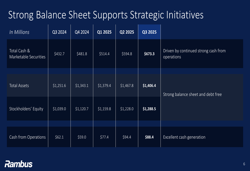 Rambus’s balance sheet continues to strengthen, with total cash and marketable securities increasing to $673.3 million in Q3 2025 from $432.7 million in Q3 2024, representing a 55.6% year-over-year increase. The company remains debt-free, providing significant financial flexibility to pursue strategic initiatives.