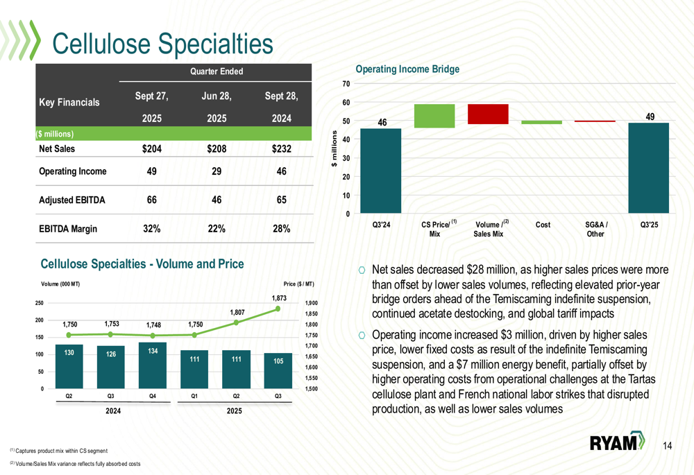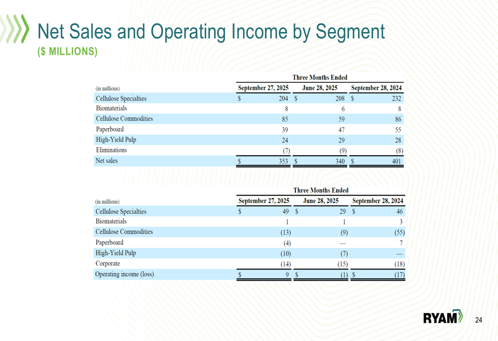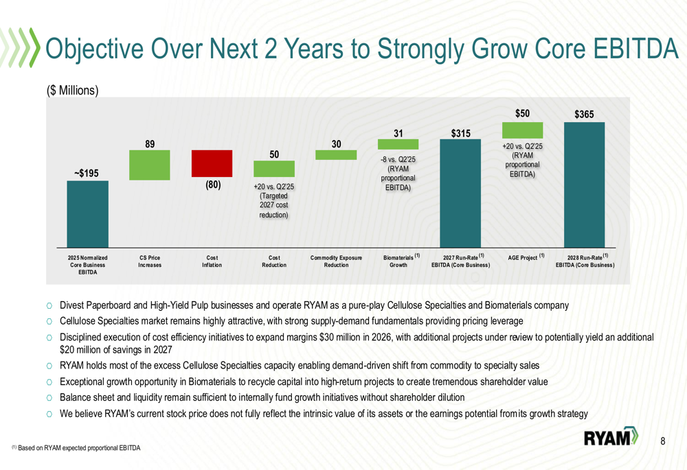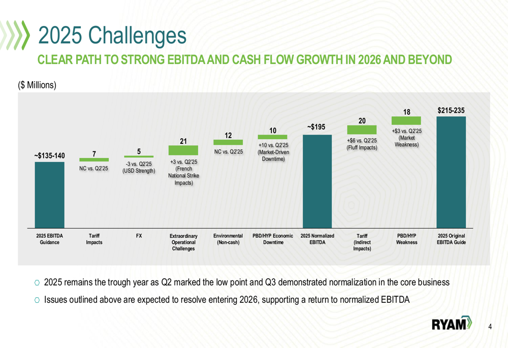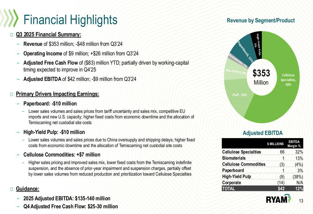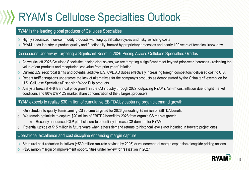 RYAM outlined a strategic pivot toward becoming a pure-play Cellulose Specialties and Biomaterials company. The plan includes divesting the underperforming Paperboard and High-Yield Pulp businesses, with particular focus on restoring profitability to the Temiscaming site before pursuing divestiture in 2026.