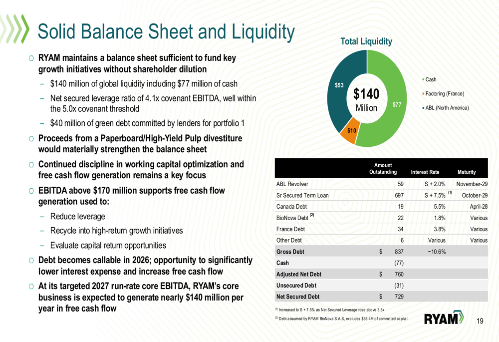 RYAM's balance sheet shows $140 million of global liquidity, including $77 million in cash, against a total debt of $837 million: