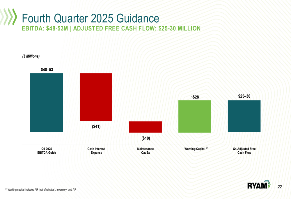 The company expects Q4 2025 EBITDA of $48-53 million and adjusted free cash flow of $25-30 million. The projected improvement in cash flow is primarily driven by working capital improvements of approximately $28 million, partially offset by cash interest expense of $41 million and maintenance capital expenditures of $10 million.