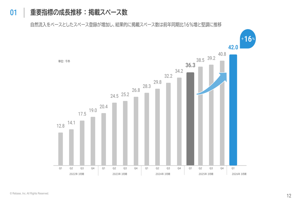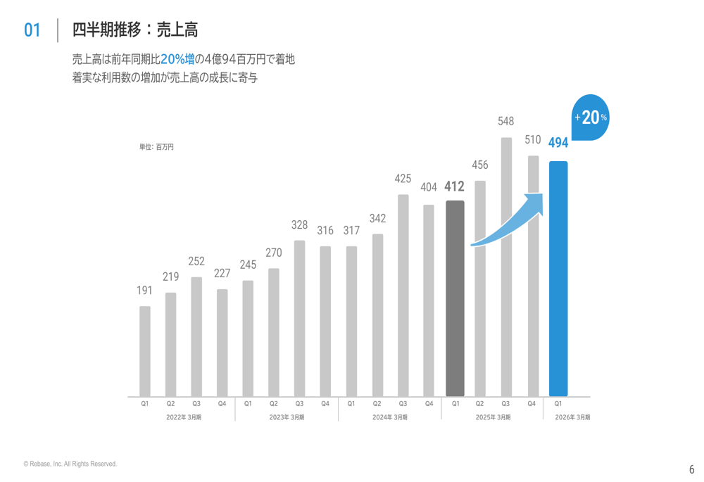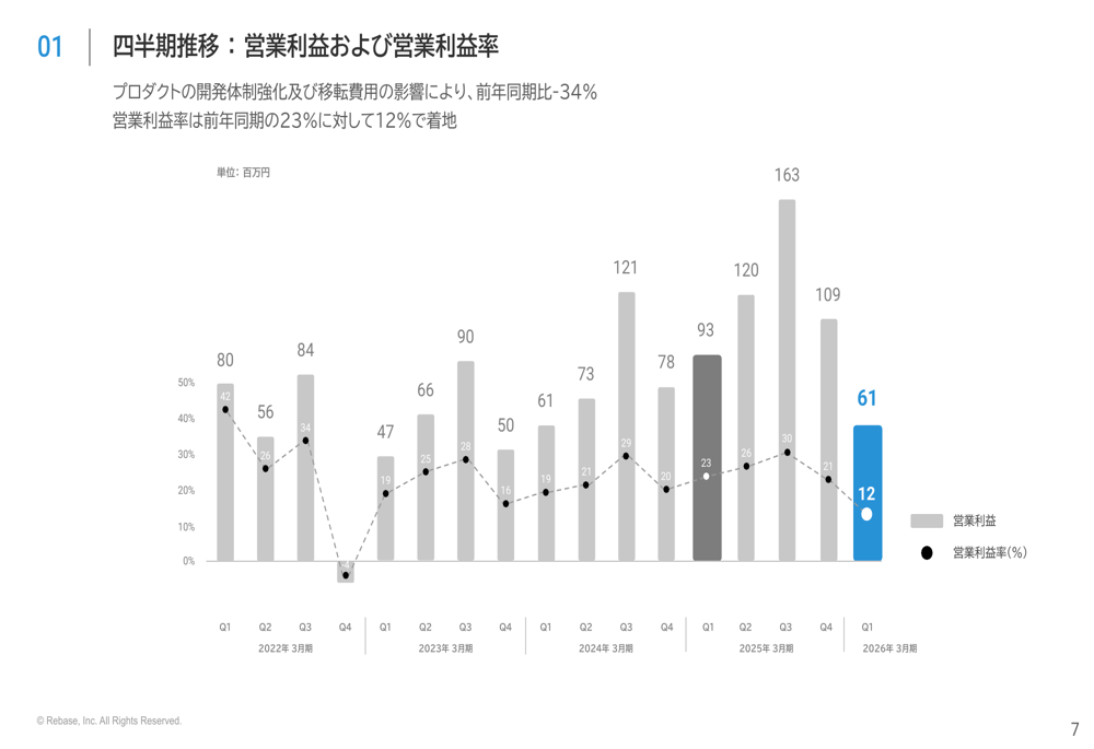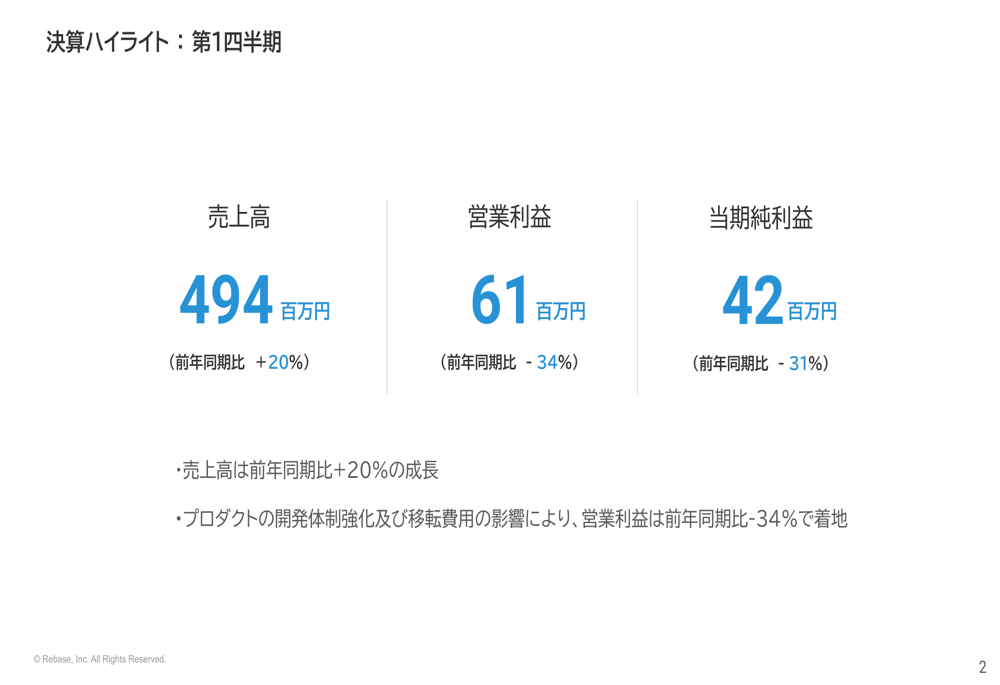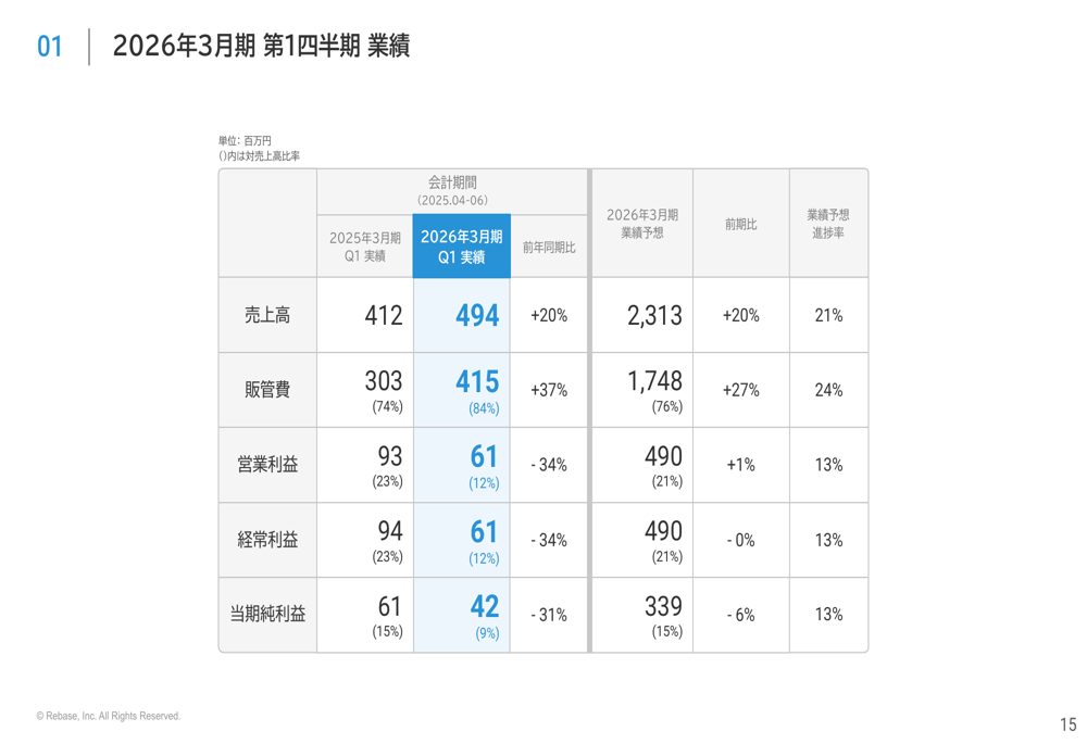 Rebase reported revenue of 494 million yen for Q1 2026, representing a 20% year-over-year increase. However, operating profit fell 34% to 61 million yen, while net profit declined 31% to 42 million yen compared to the same period last year. The company attributed this profit decline to investments in strengthening its product development system and costs associated with office relocation.