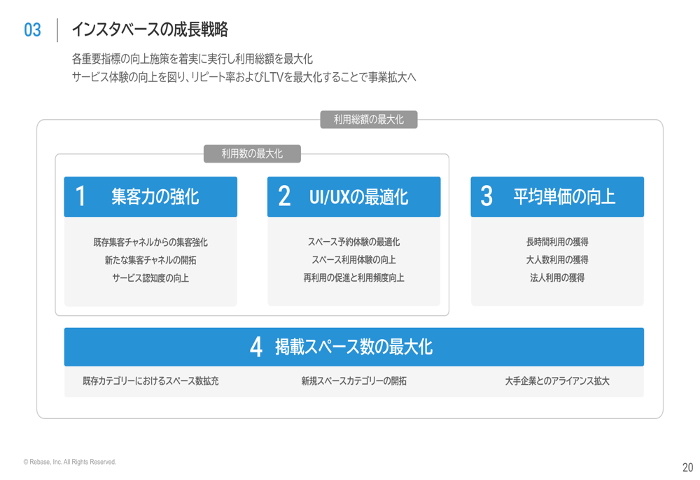 Rebase outlined four key growth strategies for its Instabase platform, focusing on strengthening customer attraction, optimizing user experience, increasing average unit price, and maximizing the number of listed spaces: