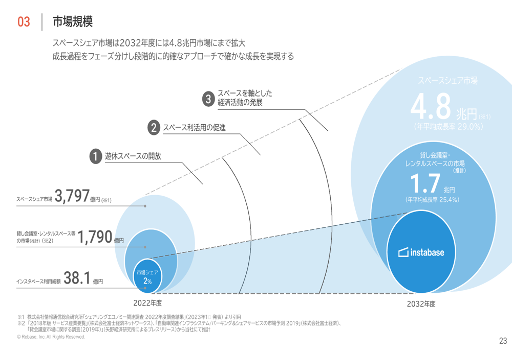 Rebase estimates the current market size for its services at 3.797 trillion yen, with the company holding approximately 2% market share. The company projects the market will grow to 4.8 trillion yen by 2032, suggesting significant room for expansion: