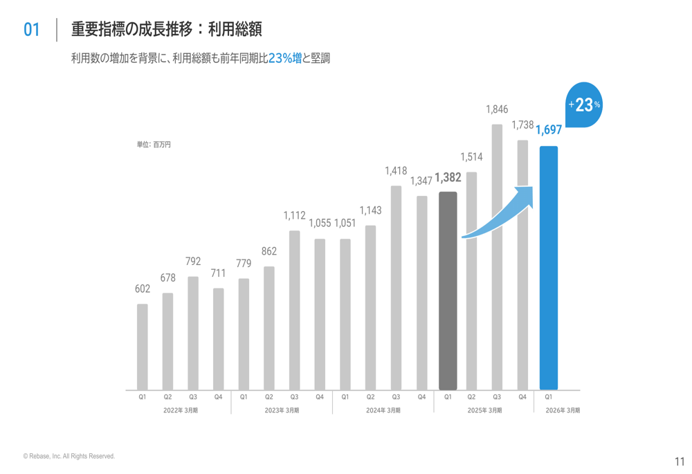 The total usage amount on the platform grew 23% year-over-year to 17.0 billion yen, showing healthy activity despite a slight decrease in average unit price to 4.2 thousand yen: