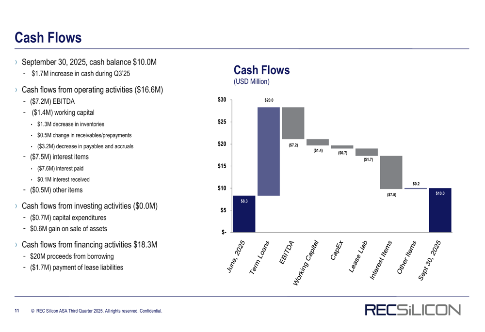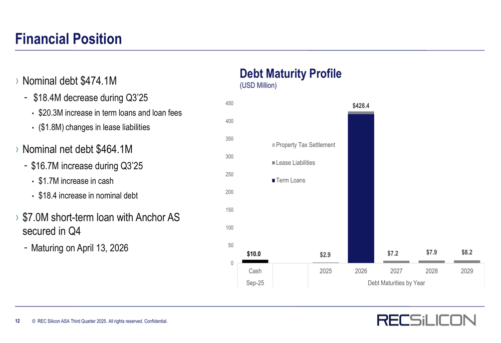 REC Silicon's financial position remains precarious, with a cash balance of $10.0 million as of September 30, 2025. While this represents a $1.7 million increase during Q3, it falls significantly short of addressing the company's substantial debt obligations.