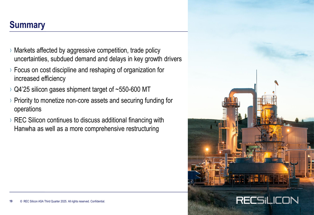 Looking forward, REC Silicon provided modest guidance for Q4 2025, targeting silicon gases shipments of approximately 550-600 MT, which would represent a slight improvement over Q3 results. However, the company acknowledged that market conditions remain challenging, with aggressive competition, trade policy uncertainties, and subdued demand continuing to impact performance.