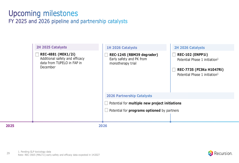 Despite the revenue challenges, Recursion emphasized its strong cash position and milestone achievements from partnerships. The company highlighted its catalyst calendar spanning from late 2025 through 2026, alongside its financial runway.