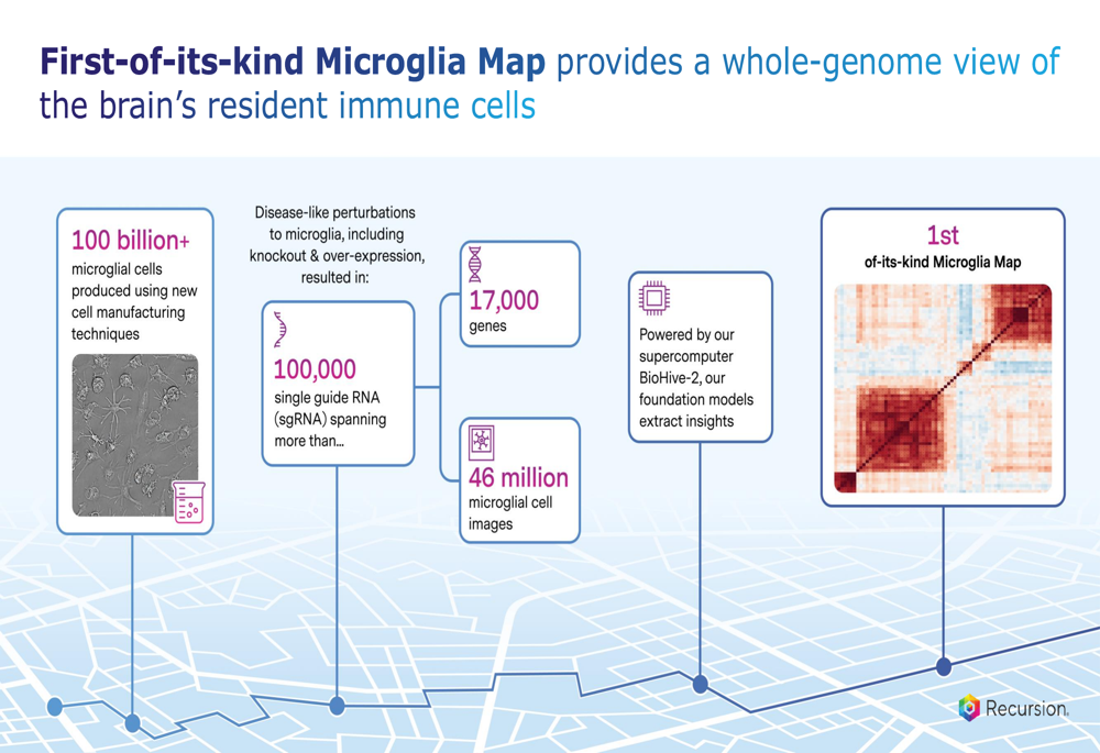 A key technological advancement highlighted was the completion of Recursion’s first-of-its-kind Microglia Map, providing a whole-genome view of the brain’s resident immune cells. This map, created from over 100 billion microglial cells, represents a significant achievement in the company’s platform development:
