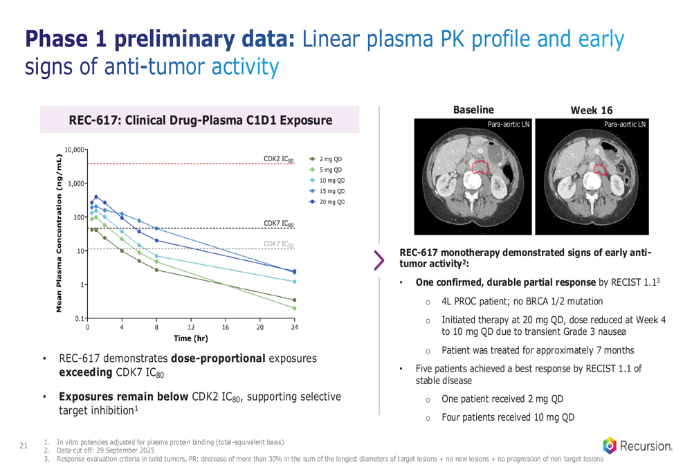 The company provided detailed updates on its lead clinical programs, including REC-617, a CDK7 inhibitor for advanced solid tumors. The Phase 1/2 ELUCIDATE trial has established a maximum tolerated dose with a manageable safety profile and early signs of anti-tumor activity: