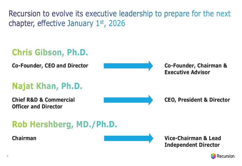 The most significant announcement from Recursion’s presentation was a major leadership transition effective January 1, 2026. Co-founder and current CEO Chris Gibson will become Chairman & Executive Advisor, while current Chief R&D & Commercial Officer Najat Khan will take over as CEO, President & Director. Current Chairman Rob Hershberg will transition to Vice-Chairman & Lead Independent Director.