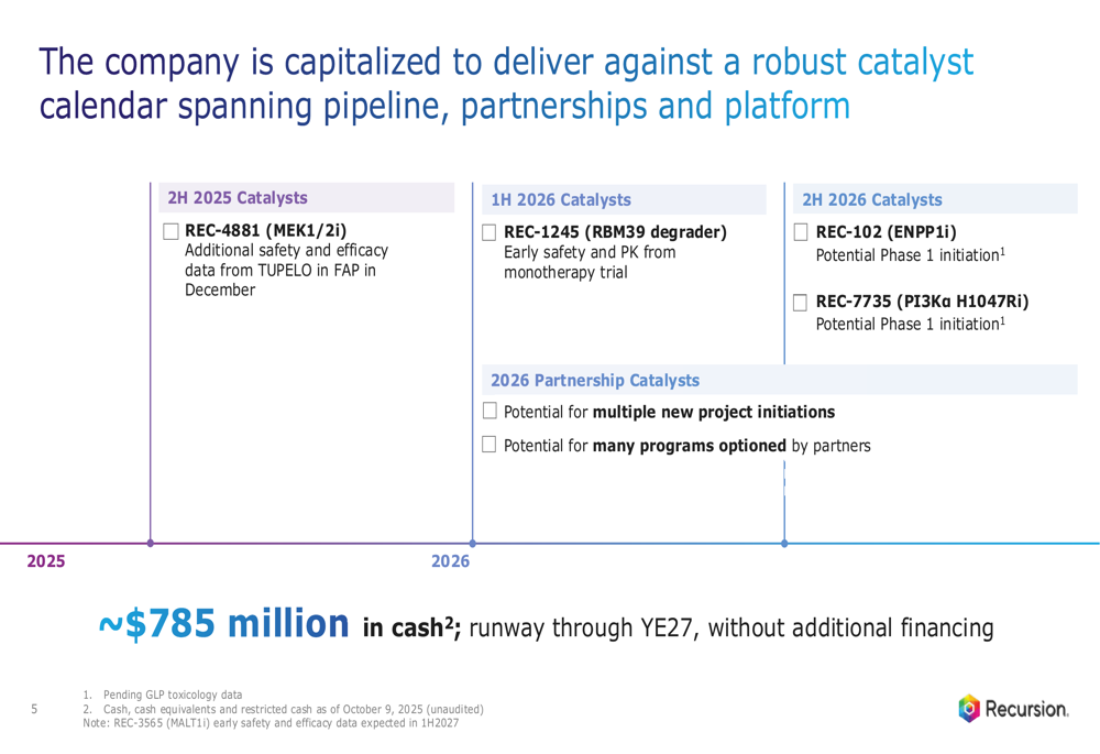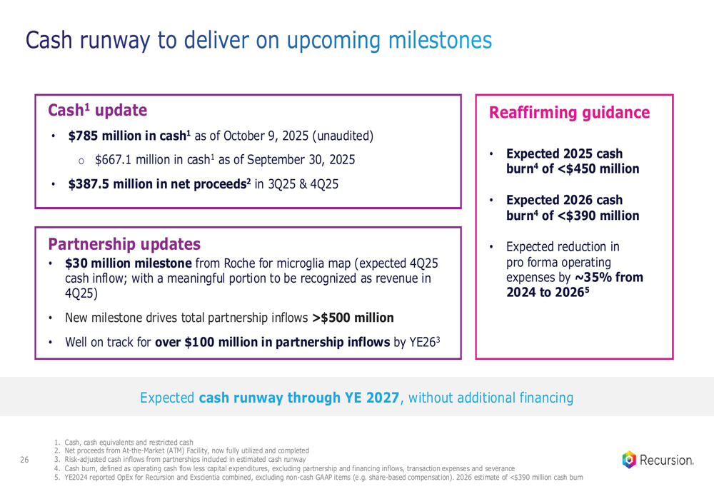 Despite the revenue miss, Recursion emphasized its strong cash position and extended runway. The company reported $785 million in cash as of October 9, 2025 (unaudited), providing runway through the end of 2027 without additional financing: