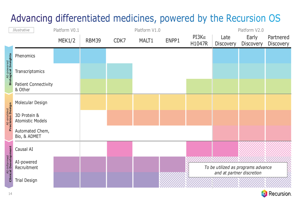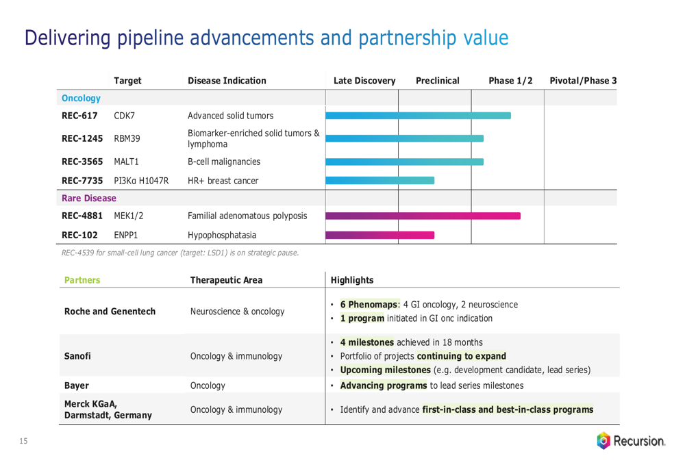 Recursion presented a comprehensive overview of its pipeline, highlighting both wholly-owned programs and partnered assets: