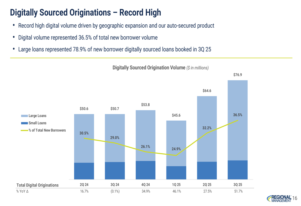 Digital originations reached a record high in Q3 2025, representing 36.5% of total new borrower volume. The company's focus on digital channels is paying dividends as shown in the following chart: