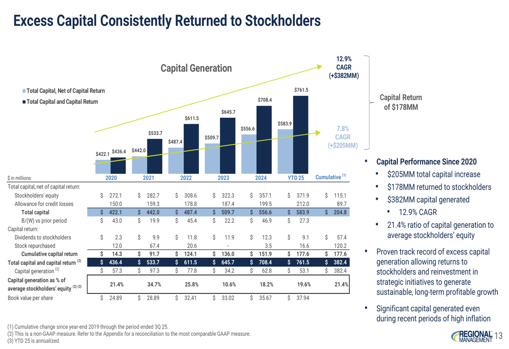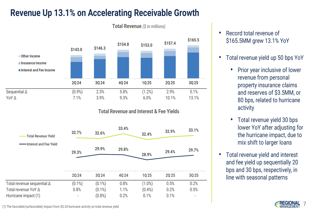 Regional Management achieved record total revenue of $165.5 million in Q3 2025, representing a 13.1% increase year-over-year. This revenue growth, coupled with improved operating efficiency, led to net income of $14.4 million and diluted earnings per share of $1.42 – an 87.3% and 86.8% increase year-over-year, respectively.