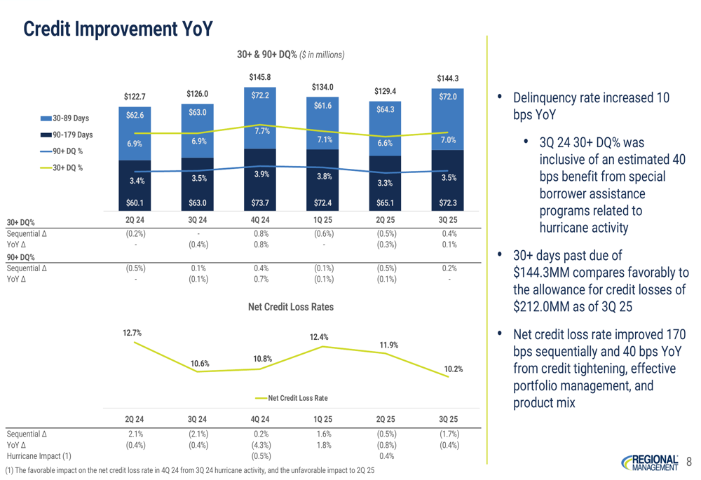 Credit performance showed improvement year-over-year, with the net credit loss rate decreasing to 10.2%, a 40 basis point improvement from Q3 2024. The 30+ day delinquency rate stood at 7.0%, representing a 30 basis point improvement year-over-year after adjusting for the prior-year hurricane impact.