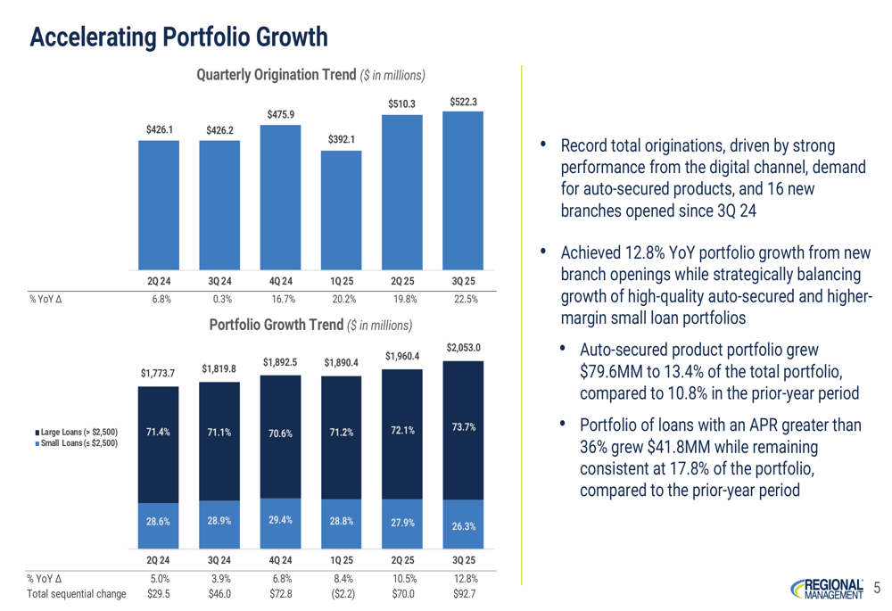 Regional Management achieved a major milestone by surpassing $2.1 billion in ending net receivables (ENR), representing $93 million in sequential growth and $233 million in year-over-year growth. This portfolio expansion was driven by strong origination volume of $522 million, up 22.5% from the prior year.