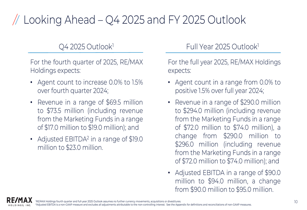 RE/MAX provided guidance for both Q4 2025 and the full year. For Q4, the company expects agent count to increase between 0.0% and 1.5% year-over-year, with revenue between $69.5 million and $73.5 million, and adjusted EBITDA between $19.0 million and $23.0 million.