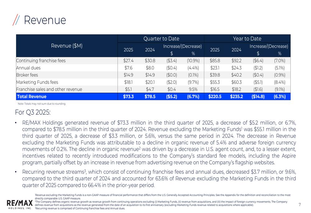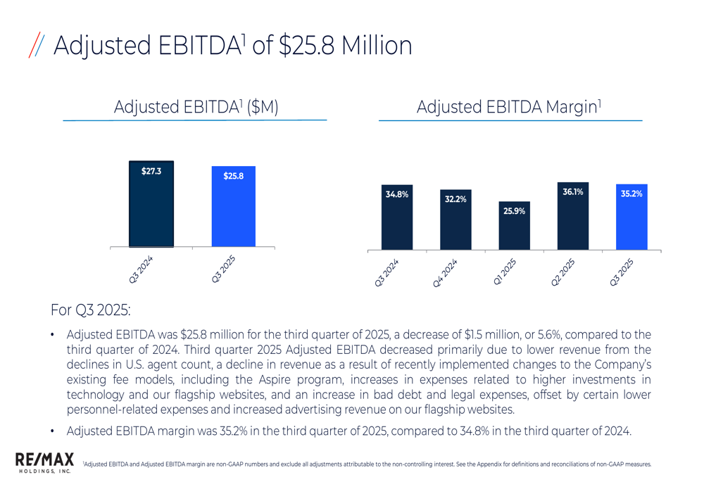 RE/MAX Holdings, Inc. (NYSE:RMAX) presented its third quarter 2025 earnings results on October 31, revealing mixed performance with declining revenue despite achieving record total agent count. The real estate franchisor reported revenue of $73.3 million, down 6.7% year-over-year, while maintaining stable profitability with a slight improvement in adjusted EBITDA margin.