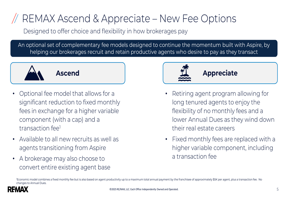 In response to the challenging domestic market, RE/MAX introduced two new fee options designed to provide flexibility for brokerages and agents. The "Ascend" model allows for reduced fixed monthly fees in exchange for higher variable components, while "Appreciate" targets retiring agents by eliminating monthly fees as they wind down their careers.