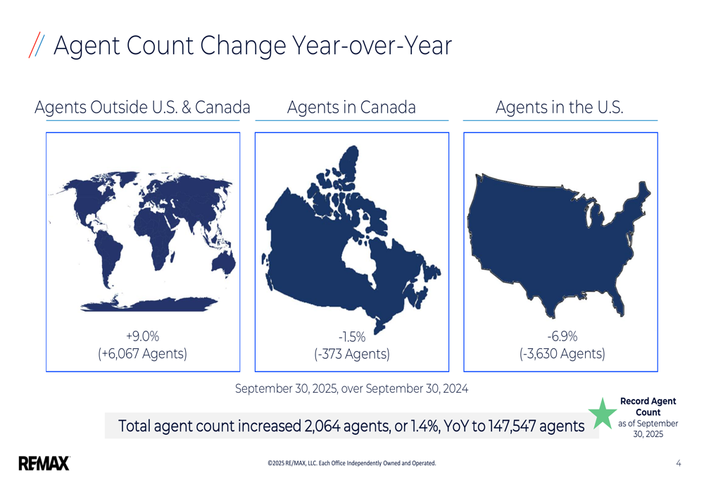 RE/MAX reported contrasting agent count trends across its markets. While total agent count reached a record 147,547 agents, representing a 1.4% year-over-year increase, this growth was entirely driven by international markets. Agent count outside the U.S. and Canada grew by 9.0% (+6,067 agents), while the combined U.S. and Canada agent count declined by 5.1% (-4,003 agents).