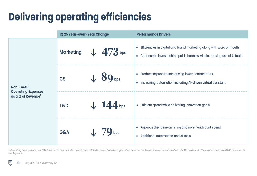 A key highlight of the presentation was Remitly’s significant improvement in operational efficiency across all expense categories. The company achieved substantial year-over-year reductions in operating expenses as a percentage of revenue: