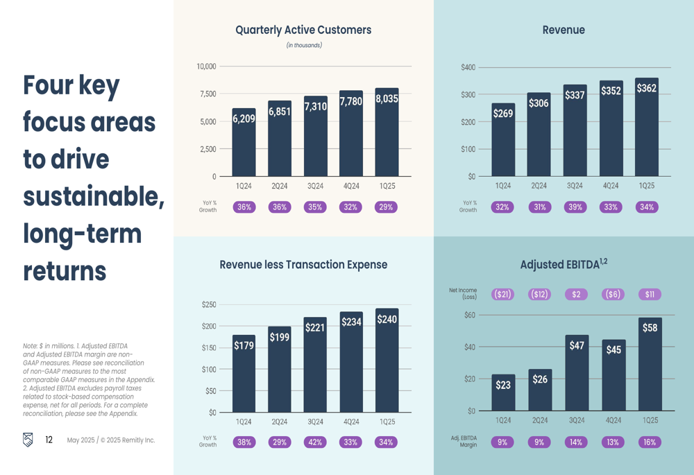Remitly’s Q1 2025 results demonstrate the company’s successful execution of its growth strategy while achieving meaningful profitability improvements. The combination of 34% revenue growth and 16.2% adjusted EBITDA margin positions the company well within the financial technology sector.