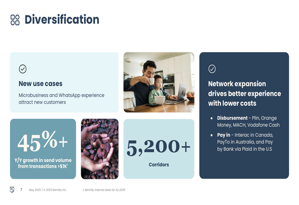 In terms of diversification, Remitly has expanded its corridor network to over 5,200 routes globally and is developing new use cases including microbusiness solutions and WhatsApp integration. The company reported 45% year-over-year growth in send volume from transactions exceeding $1,000, indicating success in expanding beyond smaller transfers.