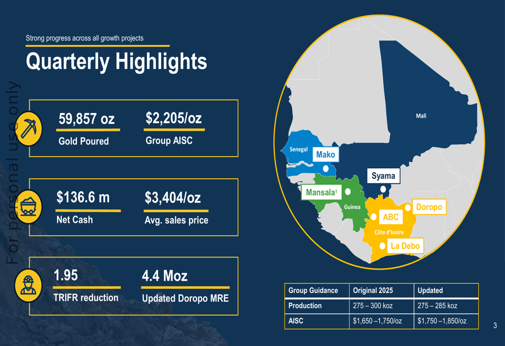 The company’s operations span multiple countries in West Africa, with its Syama mine in Mali contributing 39,918 ounces at an AISC of $2,358/oz during the quarter, while the Mako operation in Senegal delivered 19,939 ounces at a more favorable AISC of $1,415/oz. The group’s overall AISC for Q3 was $2,205/oz, higher than the year-to-date average of $1,834/oz.