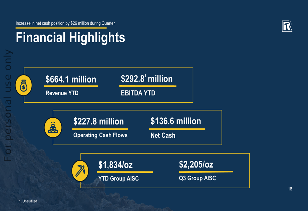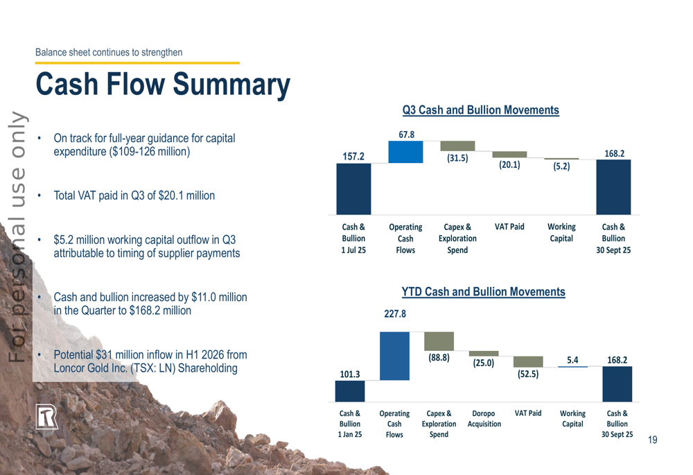 Cash and bullion increased by $11.0 million during the quarter to reach $168.2 million, despite significant capital expenditure and working capital outflows. The company paid $20.1 million in VAT during Q3 and experienced a $5.2 million working capital outflow.